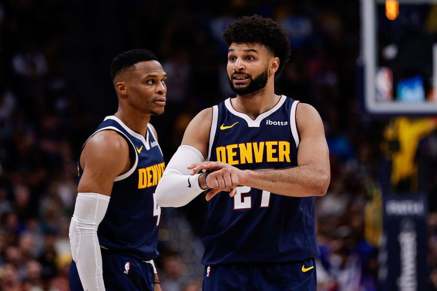 Oct 26, 2024; Denver, Colorado, USA; Denver Nuggets guard Jamal Murray (27) gestures ahead of guard Russell Westbrook (4) in the fourth quarter against the Los Angeles Clippers at Ball Arena. Mandatory Credit: Isaiah J. Downing-Imagn Images