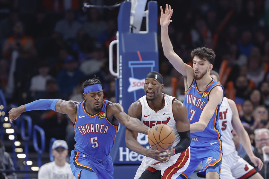 Mar 8, 2024; Oklahoma City, Oklahoma, USA; Oklahoma City Thunder guard Luguentz Dort (5) steals the ball from Miami Heat center Bam Adebayo (13) during the second half at Paycom Center. Mandatory Credit: Alonzo Adams-USA TODAY Sports