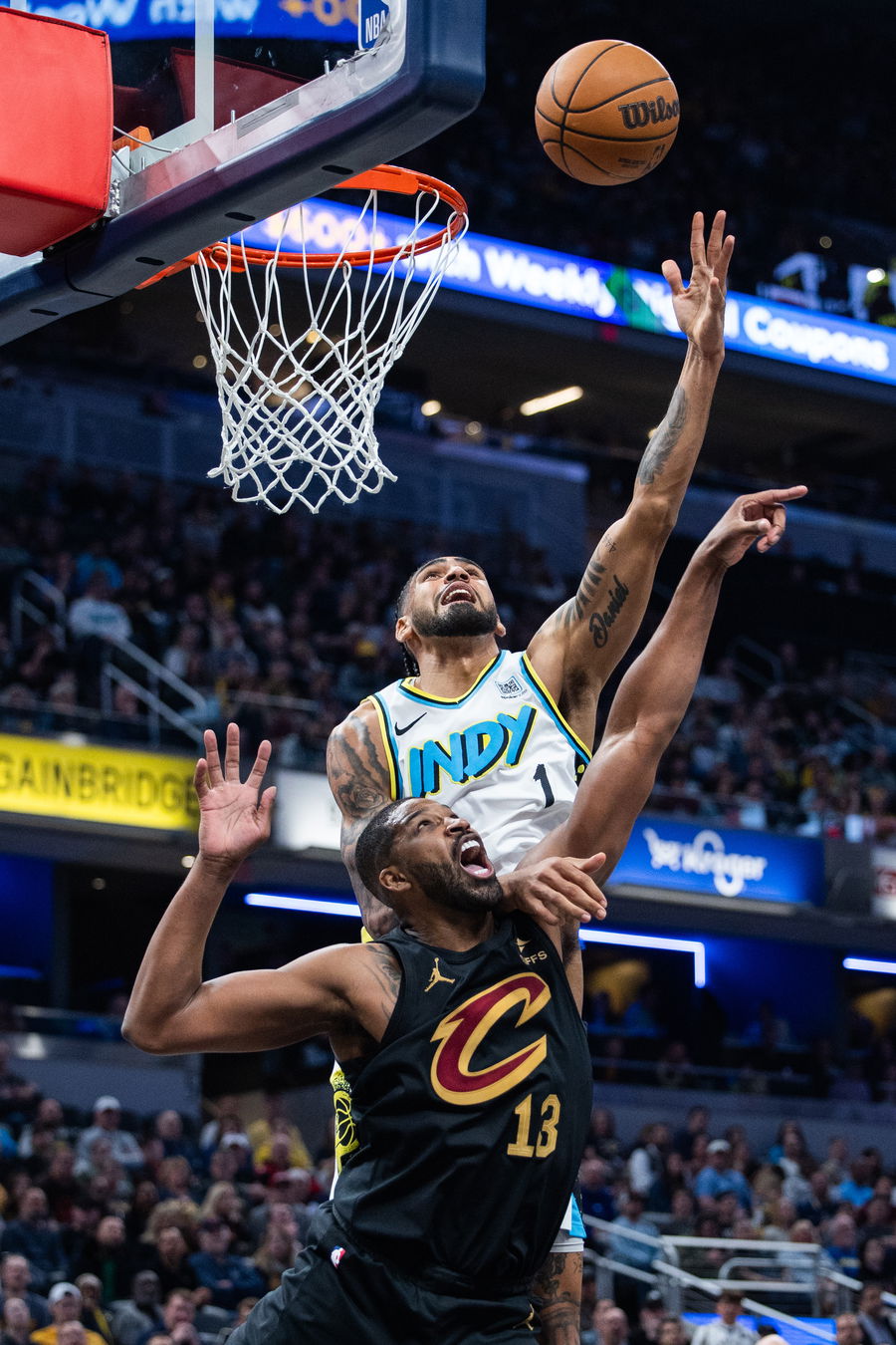 Apr 10, 2025; Indianapolis, Indiana, USA; Indiana Pacers forward Obi Toppin (1) shoots the ball while Cleveland Cavaliers center Tristan Thompson (13) defends in the second half at Gainbridge Fieldhouse. Mandatory Credit: Trevor Ruszkowski-Imagn Images