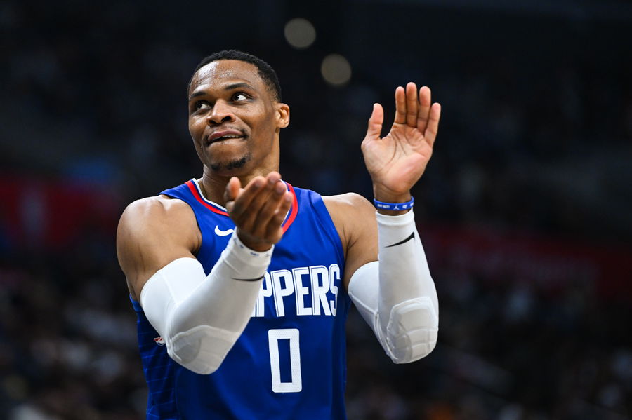 Jan 1, 2024; Los Angeles, California, USA; Los Angeles Clippers guard Russell Westbrook (0) reacts after a teammate scores against the Miami Heat during the third quarter at Crypto.com Arena. Mandatory Credit: Jonathan Hui-USA TODAY Sports