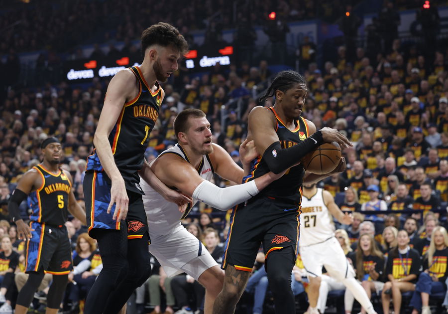 May 5, 2025; Oklahoma City, Oklahoma, USA; Denver Nuggets center Nikola Jokic (15) loses the ball to Oklahoma City Thunder forward Jalen Williams (8) during the second quarter during game one of the second round for the 2025 NBA Playoffs at Paycom Center. Mandatory Credit: Alonzo Adams-Imagn Images