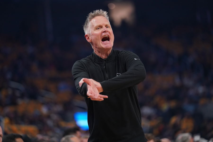 Apr 15, 2025; San Francisco, California, USA; Golden State Warriors head coach Steve Kerr reacts after a play against the Memphis Grizzlies in the first quarter at the Chase Center. Mandatory Credit: Cary Edmondson-Imagn Images