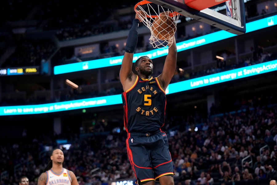 Jan 29, 2025; San Francisco, California, USA; Golden State Warriors forward Kevon Looney (5) dunks the ball against the Oklahoma City Thunder in the third quarter at the Chase Center. Mandatory Credit: Cary Edmondson-Imagn Images