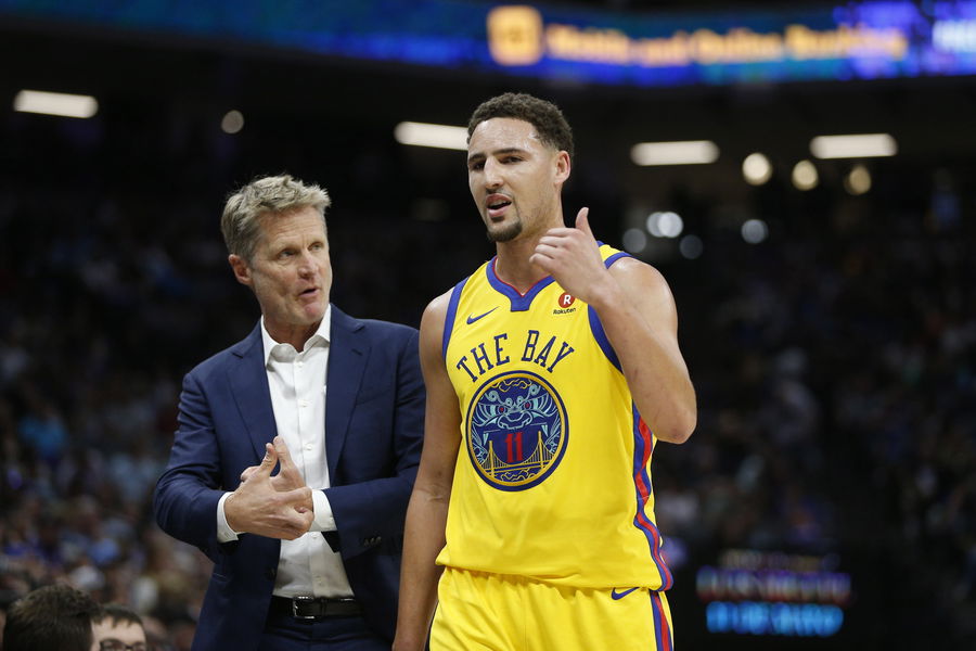 Mar 31, 2018; Sacramento, CA, USA; Golden State Warriors guard Klay Thompson (11) talks with head coach Steve Kerr during a break in the action against the Sacramento Kings in the second quarter at the Golden 1 Center. Mandatory Credit: Cary Edmondson-USA TODAY Sports
