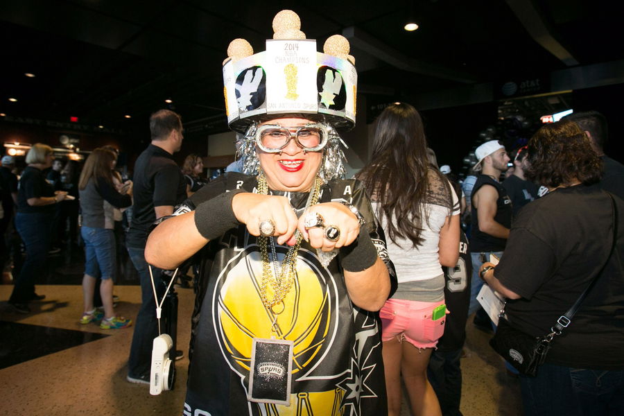 Oct 28, 2014; San Antonio, TX, USA; San Antonio Spurs fan Sovia Lauriano shows off her championship replica ring prior to a game against the Dallas Mavericks at AT&T Center. Mandatory Credit: Soobum Im-USA TODAY Sports