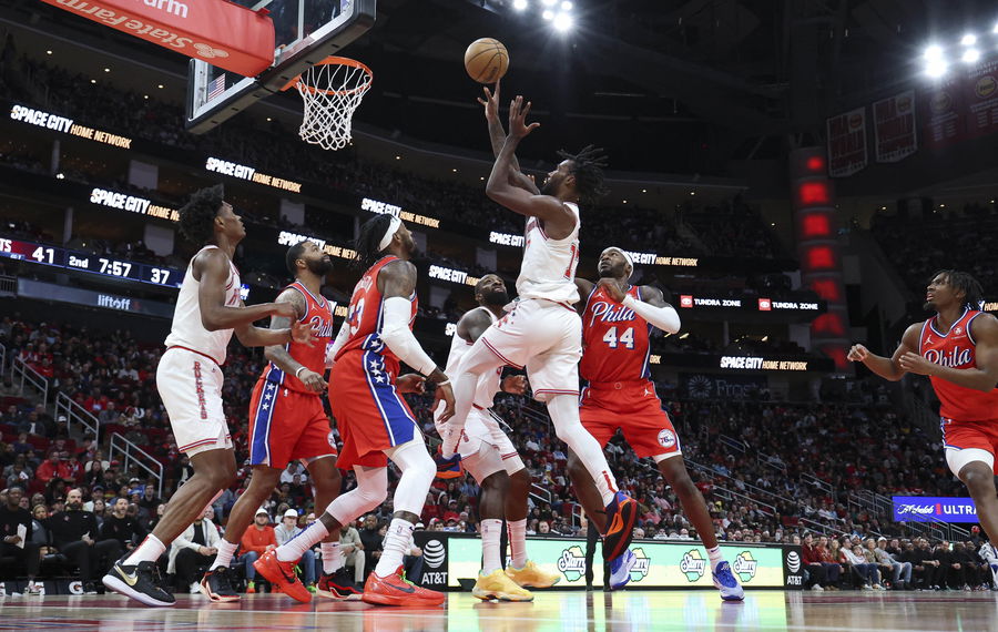 Dec 29, 2023; Houston, Texas, USA; Houston Rockets forward Tari Eason (17) scores a basket during the second quarter against the Philadelphia 76ers at Toyota Center. Mandatory Credit: Troy Taormina-USA TODAY Sports