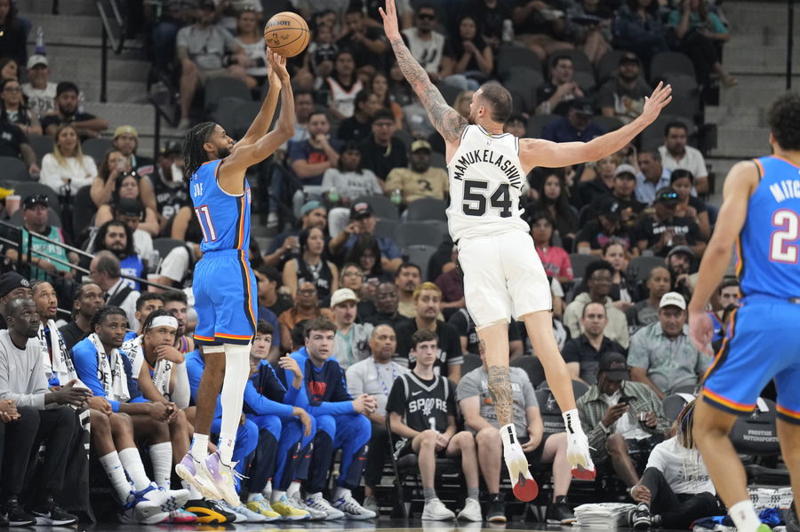 Oct 7, 2024; San Antonio, Texas, USA; Oklahoma City Thunder guard Isaiah Joe (11) shoots over San Antonio Spurs forward Sandro Mamukelashvili (54) during the first half at Frost Bank Center. Mandatory Credit: Scott Wachter-Imagn Images