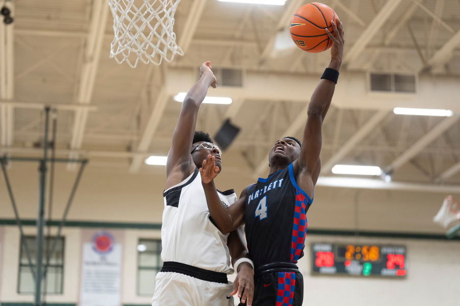 Sierra Canyon’s Bryce James, the son of NBA player LeBron James, jump to block Bartlett’s Bryson Johnson (4) as he goes for a layup during the game between Sierra Canyon and Bartlett High School during Memphis Hoopfest in Eads, Tenn., on Friday, January 3, 2025.
