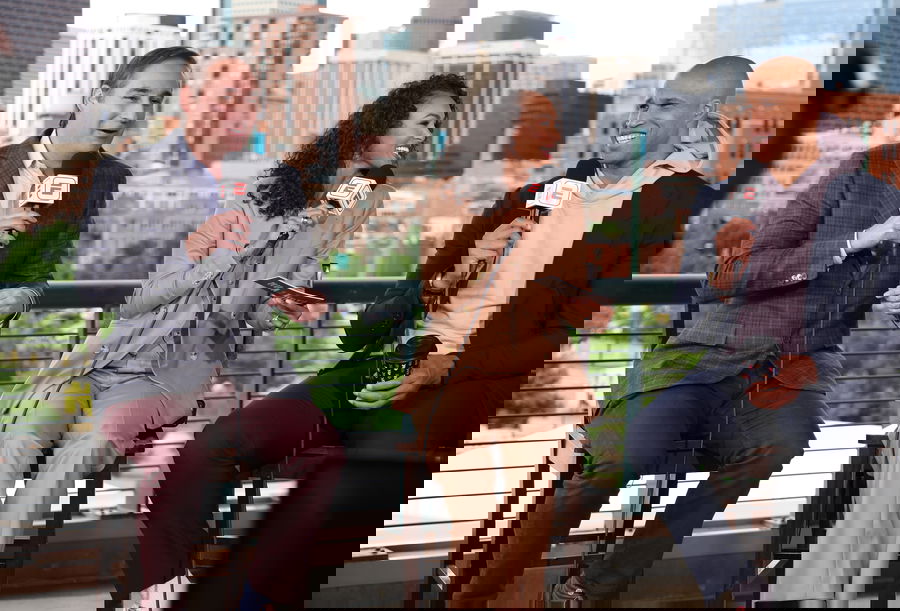 DENVER, CO – JUNE 12: Zach Lowe, Malika Andrews and Richard Jefferson chats during the NBA Today show prior to Game Five of the 2023 NBA Finals on June 12, 2023 at Ball Arena in Denver, Colorado. NOTE TO USER: User expressly acknowledges and agrees that, by downloading and or using this Photograph, user is consenting to the terms and conditions of the Getty Images License Agreement. Mandatory Copyright Notice: Copyright 2023 NBAE (Photo by Joe Murphy/NBAE/Getty Images)