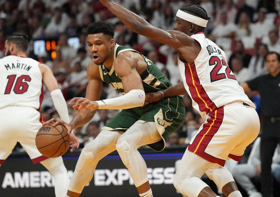 Apr 24, 2023; Miami, Florida, USA; Miami Heat forward Jimmy Butler (22) defends Milwaukee Bucks forward Giannis Antetokounmpo (34) in the first quarter during game four of the 2023 NBA Playoffs at Kaseya Center. Mandatory Credit: Jim Rassol-USA TODAY Sports