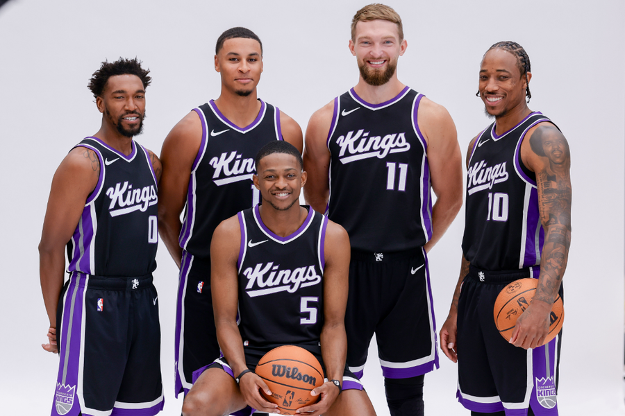Sep 30, 2024; Sacramento, CA, USA; Sacramento Kings guard Malik Monk (0) and forward Keegan Murray (13) and forward Domantas Sabonis (11) and forward DeMar DeRozan (10) and guard De’Aaron Fox (5) pose for a photo during media day at Golden 1 Center. Mandatory Credit: Sergio Estrada-Imagn Images