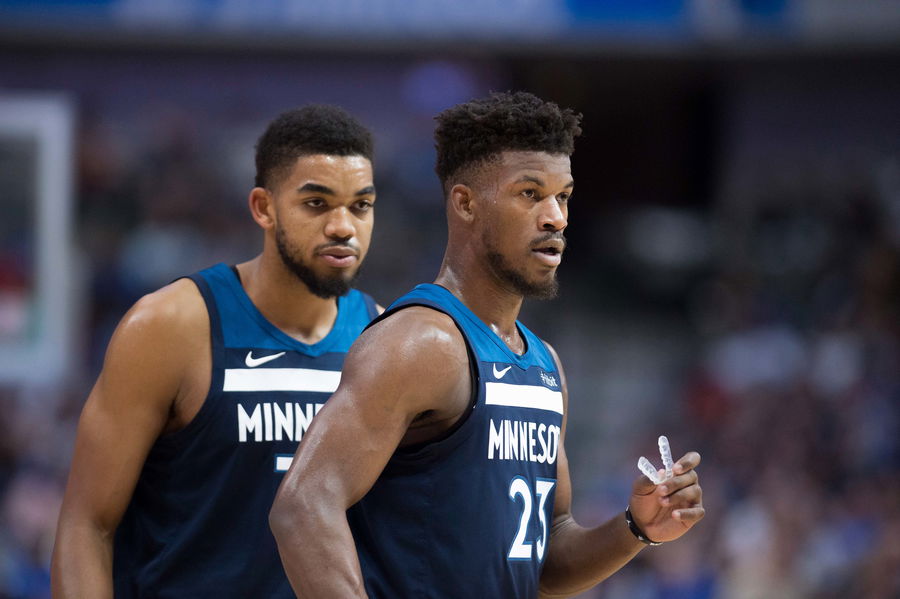 Nov 17, 2017; Dallas, TX, USA; Minnesota Timberwolves center Karl-Anthony Towns (32) and guard Jimmy Butler (23) during the game against the Dallas Mavericks at the American Airlines Center. The Timberwolves defeat the Mavericks 111-87. Mandatory Credit: Jerome Miron-USA TODAY Sports