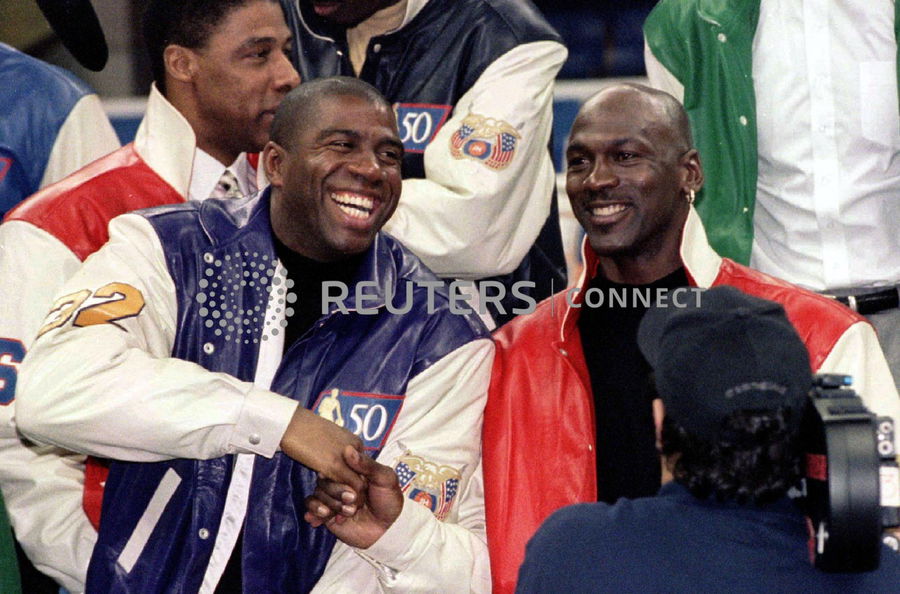 Magic Johnson (L) and Michael Jordan enjoy a light moment as they prepare to have a group photo taken Febuary 8. The NBA celebrating their 50th anniversary selected the top 50 players as they pose for their photo at the Gund Arena. The NBA All-Star game will be played here on Febuary 9.