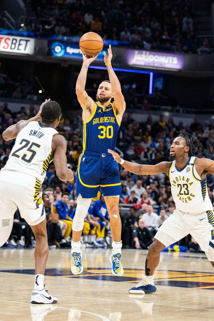 Feb 8, 2024; Indianapolis, Indiana, USA; Golden State Warriors guard Stephen Curry (30) shoots the ball while Indiana Pacers forward Jalen Smith (25) and forward Aaron Nesmith (23) defend in the first half at Gainbridge Fieldhouse. Mandatory Credit: Trevor Ruszkowski-USA TODAY Sports