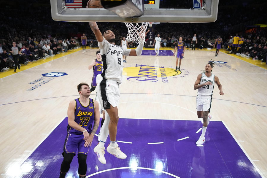 Mar 17, 2025; Los Angeles, California, USA; San Antonio Spurs guard Stephon Castle (5) shoots the ball against Los Angeles Lakers guard Luka Doncic (77) in the second half at the Crypto.com Arena. Mandatory Credit: Kirby Lee-Imagn Images