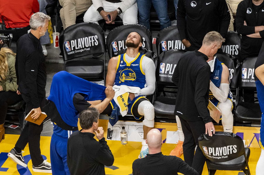 Golden State Warriors guard Stephen Curry (30) is seen on the bench in the closing seconds in Game Six of the Western Conference Semifinals against the Los Angeles Lakers in Los Angeles, California Friday, May 12, 2023. The Lakers defeated the Warriors 122-101 to advance to the Western Conference Finals against the Denver Nuggets