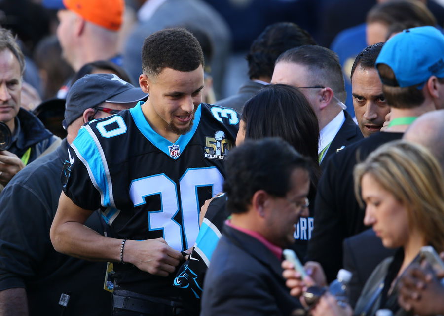 Feb 7, 2016; Santa Clara, CA, USA; Golden State Warriors guard Stephen Curry on the sidelines prior to Super Bowl 50 between the Carolina Panthers and the Denver Broncos at Levi’s Stadium. Mandatory Credit: Kelley L Cox-USA TODAY Sports