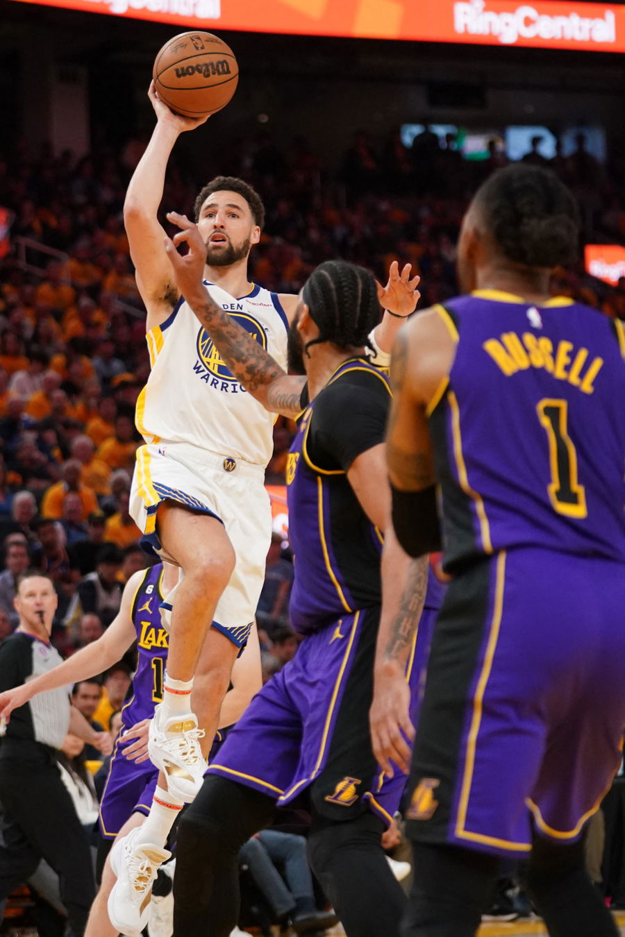 May 4, 2023; San Francisco, California, USA; Golden State Warriors guard Klay Thompson (11) shoots the ball against the Los Angeles Lakers in the third quarter during game two of the 2023 NBA playoffs at the Chase Center. Mandatory Credit: Cary Edmondson-USA TODAY Sports