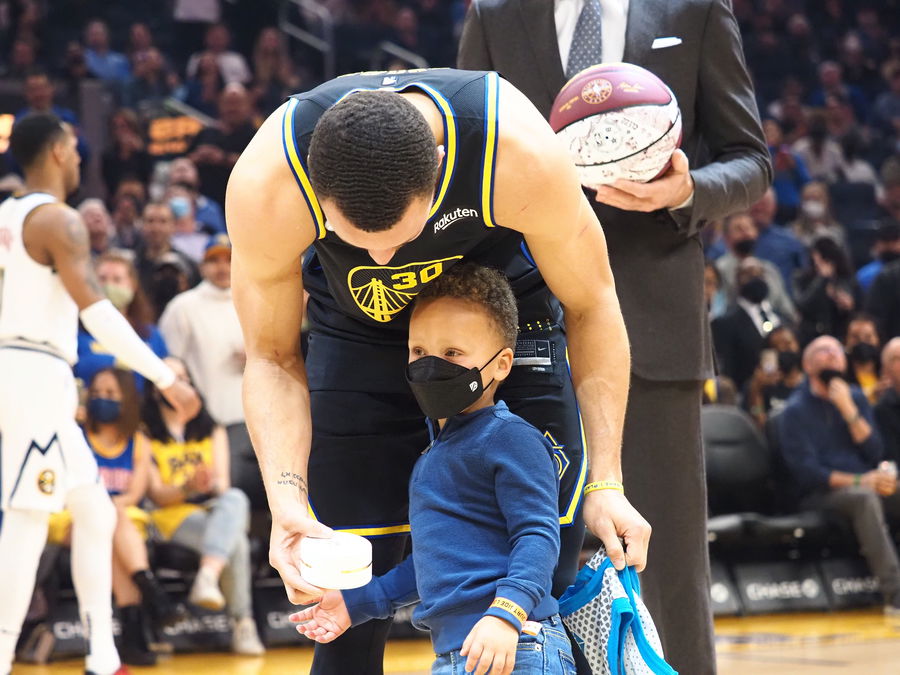 Feb 16, 2022; San Francisco, California, USA; Golden State Warriors guard Stephen Curry (30) with his son, Canon Curry, as he receives his all star jersey before the game against the Denver Nuggets at Chase Center. Mandatory Credit: Kelley L Cox-USA TODAY Sports