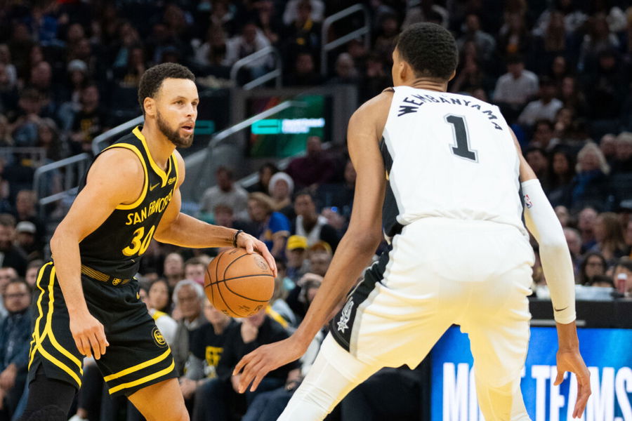 November 24, 2023; San Francisco, California, USA; Golden State Warriors guard Stephen Curry (30) dribbles the basketball against San Antonio Spurs center Victor Wembanyama (1) during the fourth quarter at Chase Center. Mandatory Credit: Kyle Terada-USA TODAY Sports