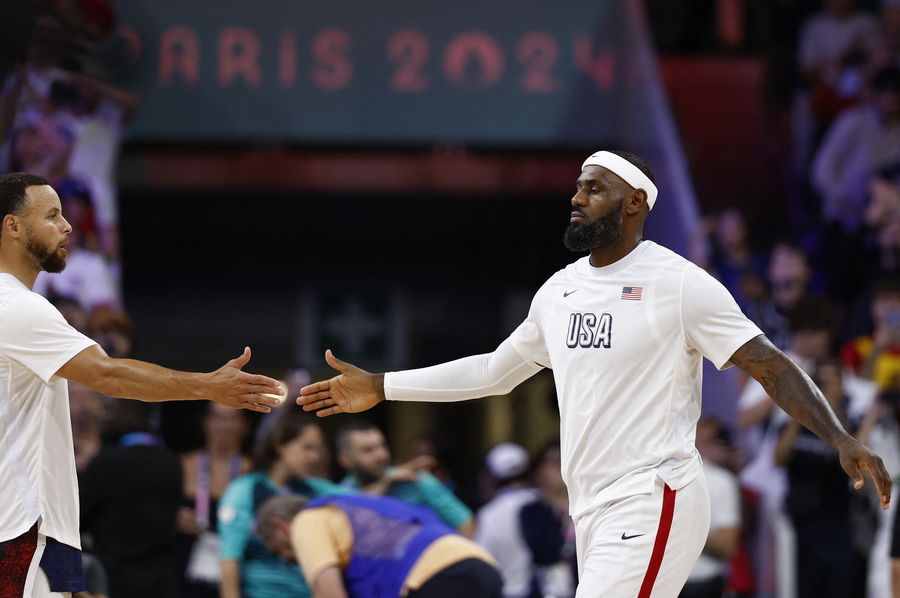 Paris 2024 Olympics – Basketball – Men’s Group Phase – Group C – Puerto Rico vs United States – Lille, Pierre Mauroy Stadium, Villeneve-d’Ascq, France – August 03, 2024. Stephen Curry of United States and Lebron James of United States before the match REUTERS/Evelyn Hockstein