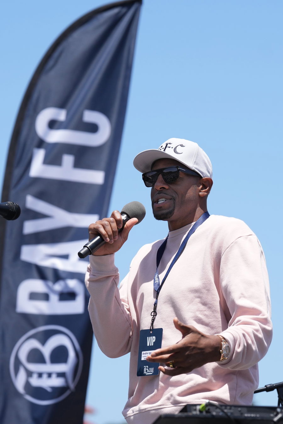 Jun 3, 2023; San Francisco, California, USA; Golden State Warriors former player Andre Iguodala speaks during the Bay FC Day for the Bay event at Presidio Main Post Lawn. Mandatory Credit: Darren Yamashita-USA TODAY Sports