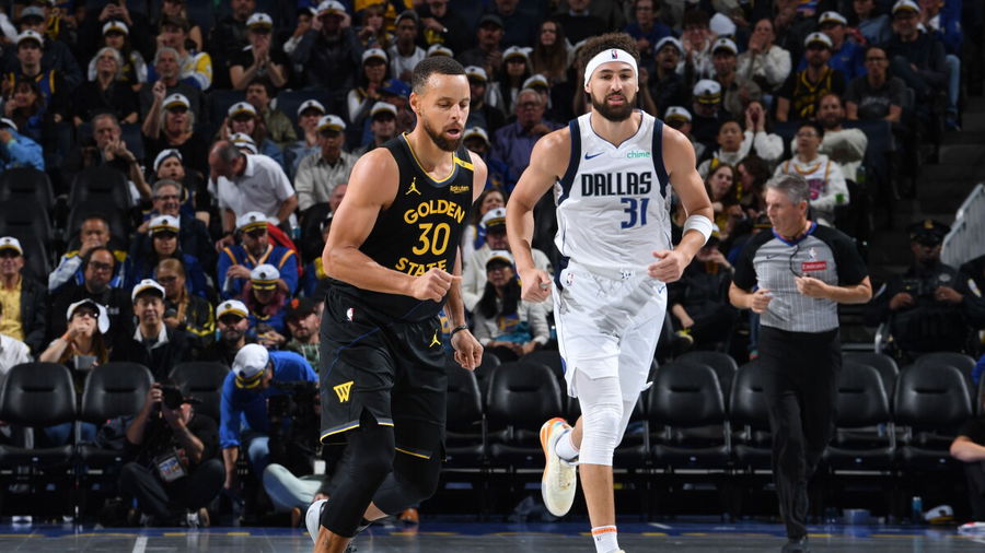 SAN FRANCISCO, CA – NOVEMBER 12: Stephen Curry #30 of the Golden State Warriors and Klay Thompson #31 of the Dallas Mavericks run up the court during the game during the Emirates NBA Cup game on November 12, 2024 at Chase Center in San Francisco, California. NOTE TO USER: User expressly acknowledges and agrees that, by downloading and or using this photograph, user is consenting to the terms and conditions of Getty Images License Agreement. Mandatory Copyright Notice: Copyright 2024 NBAE (Photo by Noah Graham/NBAE via Getty Images)