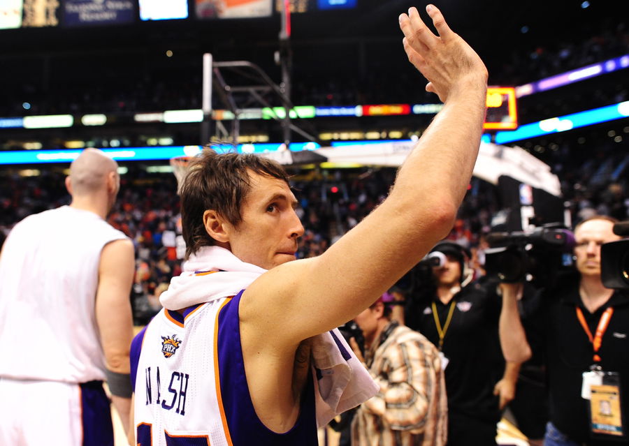 Apr. 25, 2012; Phoenix, AZ, USA; Phoenix Suns guard Steve Nash waves to the fans following the game against the San Antonio Spurs at the US Airways Center. Mandatory Credit: Mark J. Rebilas-USA TODAY Sports