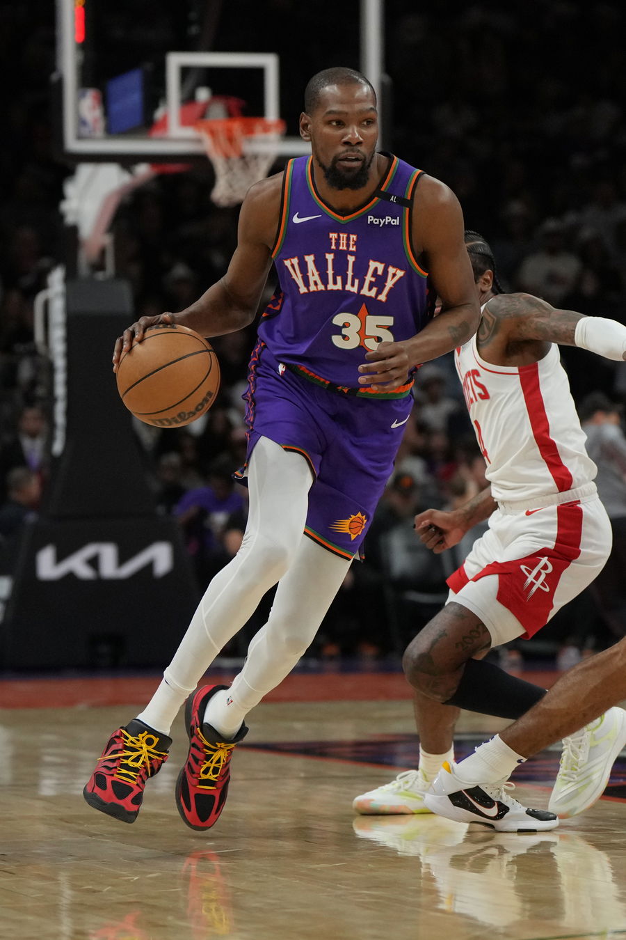 Mar 30, 2025; Phoenix, Arizona, USA; Phoenix Suns forward Kevin Durant (35) drives against the Houston Rockets in the first half at Footprint Center. Mandatory Credit: Rick Scuteri-Imagn Images