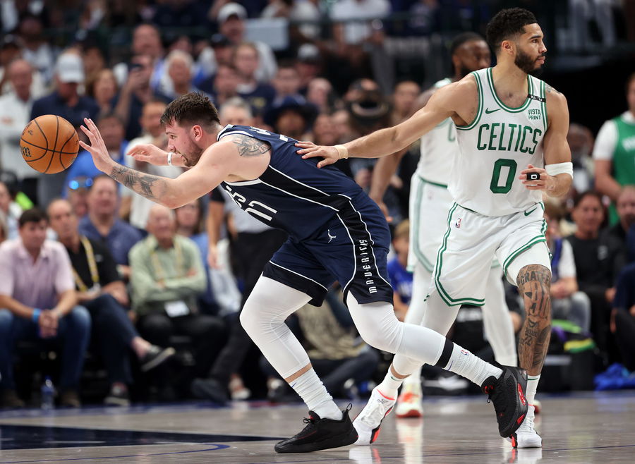 Jun 14, 2024; Dallas, Texas, USA; Dallas Mavericks guard Luka Doncic (77) controls the ball against Boston Celtics forward Jayson Tatum (0) during the first quarter during game four of the 2024 NBA Finals at American Airlines Center. Mandatory Credit: Peter Casey-USA TODAY Sports