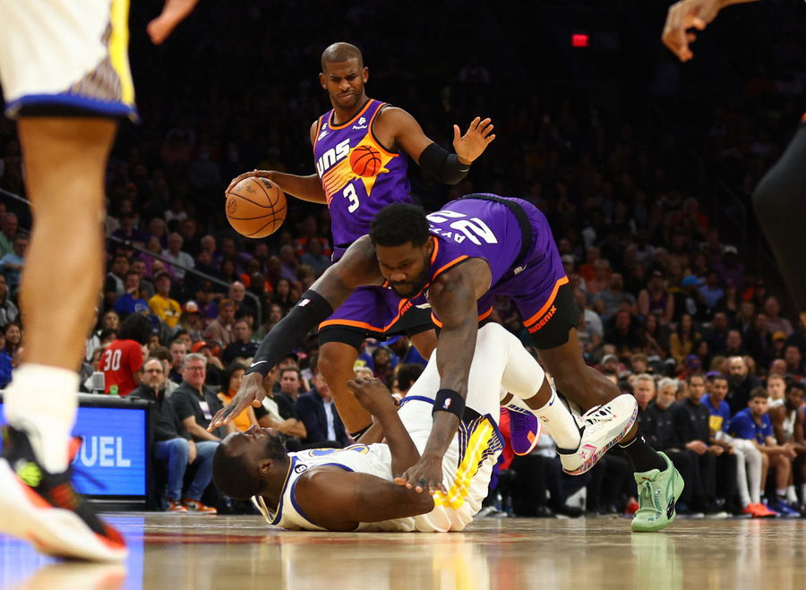 Oct 25, 2022; Phoenix, Arizona, USA; Phoenix Suns center Deandre Ayton (22) collides with Golden State Warriors forward Draymond Green (23) in the first half at Footprint Center. Mandatory Credit: Mark J. Rebilas-USA TODAY Sports