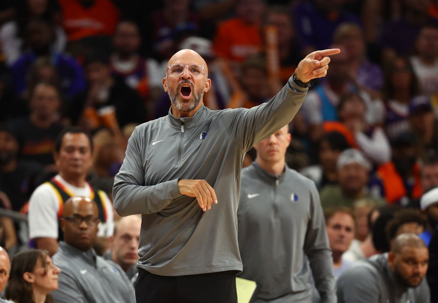 Oct 26, 2024; Phoenix, Arizona, USA; Dallas Mavericks head coach Jason Kidd against the Phoenix Suns at Footprint Center. Mandatory Credit: Mark J. Rebilas-Imagn Images