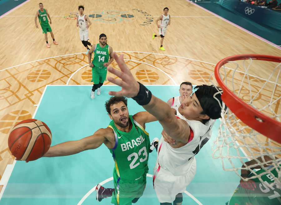 Paris 2024 Olympics – Basketball – Men’s Group Phase – Group B – Japan vs Brazil – Lille, Pierre Mauroy Stadium, Villeneve-d’Ascq, France – August 02, 2024. Raul Neto of Brazil in action against Yuta Watanabe of Japan Pool via REUTERS/Greg Shamus