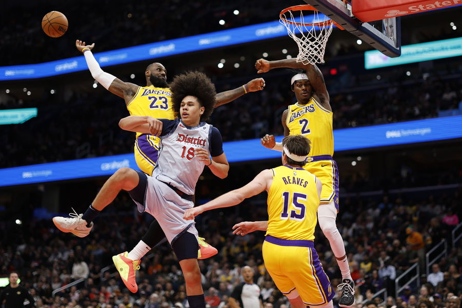 Jan 29, 2025; Washington, District of Columbia, USA; Los Angeles Lakers forward LeBron James (23) attempts to dunk an alley cop pass from Lakers guard Austin Reaves (15) as Washington Wizards forward Kyshawn George (18) defends in the second quarter at Capital One Arena. Mandatory Credit: Geoff Burke-Imagn Images