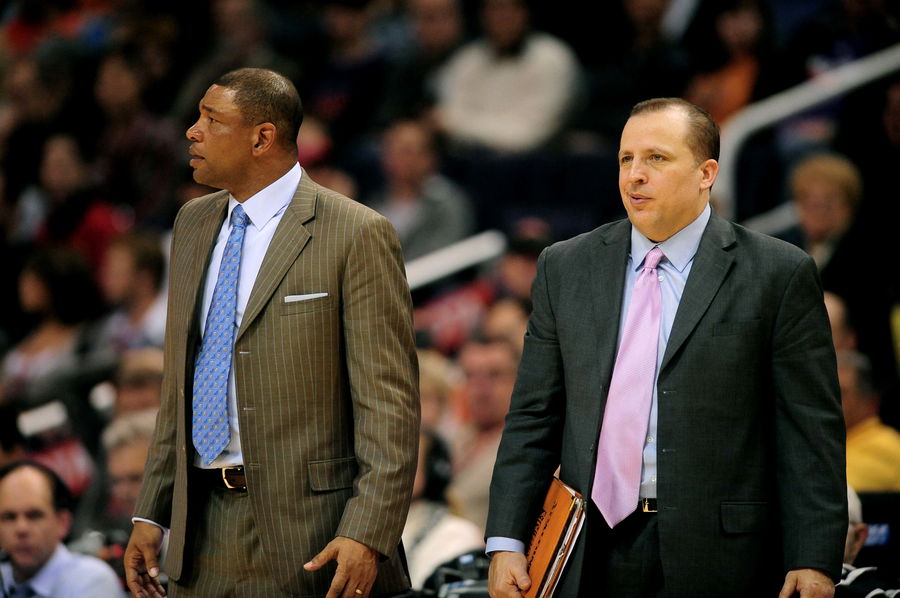 Dec. 30, 2009; Phoenix, AZ, USA; Boston Celtics head coach Doc Rivers (left) and associate head coach Tom Thibodeau against the Phoenix Suns at the US Airways Center. The Suns defeated the Celtics 116-98. Mandatory Credit: Mark J. Rebilas-USA TODAY Sports