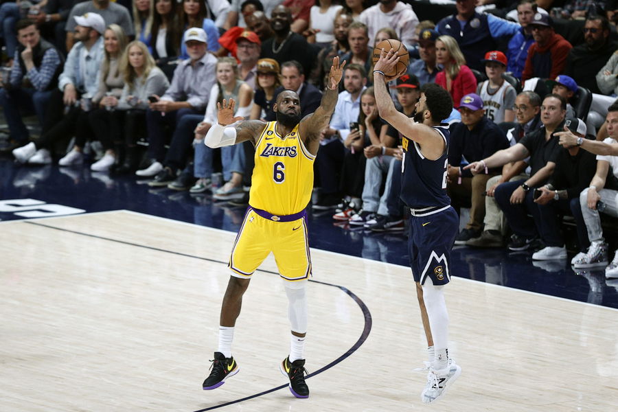 May 18, 2023; Denver, Colorado, USA; Denver Nuggets guard Jamal Murray (27) shoots against Los Angeles Lakers forward LeBron James (6) in the fourth quarter during game two of the Western Conference Finals for the 2023 NBA playoffs at Ball Arena. Mandatory Credit: Isaiah J. Downing-USA TODAY Sports