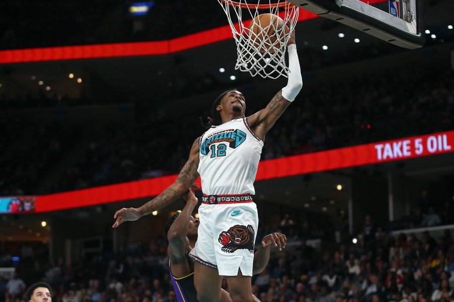 Nov 6, 2024; Memphis, Tennessee, USA; Memphis Grizzlies guard Ja Morant (12) drives to the basket during the second half against the Los Angeles Lakers at FedExForum. Mandatory Credit: Petre Thomas-Imagn Images