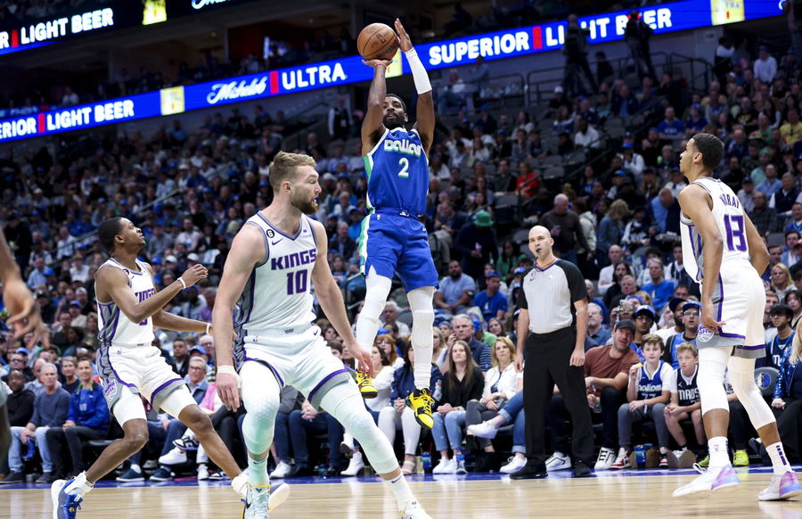 Apr 5, 2023; Dallas, Texas, USA; Dallas Mavericks guard Kyrie Irving (2) shoots over Sacramento Kings forward Domantas Sabonis (10) during the first quarter at American Airlines Center. Mandatory Credit: Kevin Jairaj-USA TODAY Sports