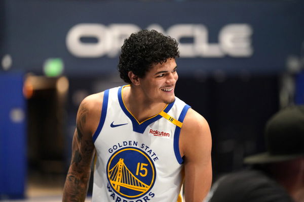 Sep 30, 2024; San Francisco, CA, USA; Golden State Warriors forward Gui Santos (15) smiles during Media Day at the Chase Center. Mandatory Credit: Cary Edmondson-Imagn Images