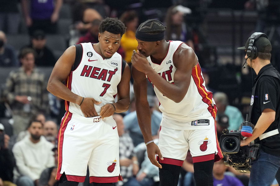 Oct 29, 2022; Sacramento, California, USA; Miami Heat guard Kyle Lowry (7) and forward Jimmy Butler (22) talk before the game against the Sacramento Kings at Golden 1 Center. Mandatory Credit: Darren Yamashita-USA TODAY Sports