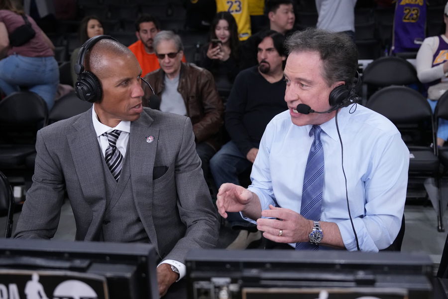 Apr 9, 2024; Los Angeles, California, USA; TNT analyst Reggie Miller (left) and play-by-play announcer Kevin Harlan during the game between the Los Angeles Lakers and the Golden State Warriors at Crypto.com Arena. Mandatory Credit: Kirby Lee-USA TODAY Sports