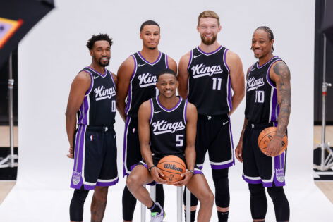Sep 30, 2024; Sacramento, CA, USA; Sacramento Kings guard Malik Monk (0) and forward Keegan Murray (13) and forward Domantas Sabonis (11) and forward DeMar DeRozan (10) and guard De’Aaron Fox (5) pose for a photo during media day at Golden 1 Center. Mandatory Credit: Sergio Estrada-Imagn Images