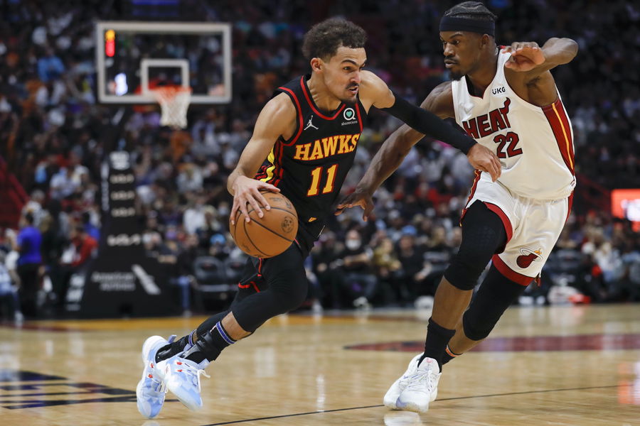 Jan 14, 2022; Miami, Florida, USA; Atlanta Hawks guard Trae Young (11) dribbles the basketball as Miami Heat forward Jimmy Butler (22) defends during the first quarter of the game at FTX Arena. Mandatory Credit: Sam Navarro-USA TODAY Sports