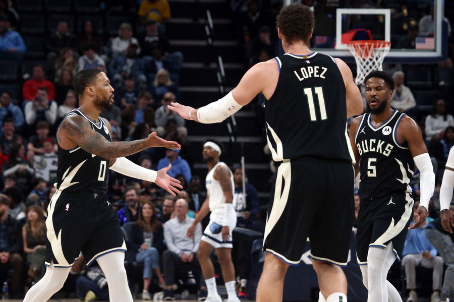 Feb 15, 2024; Memphis, Tennessee, USA; Milwaukee Bucks guard Damian Lillard (0) reacts with Milwaukee Bucks center Brook Lopez (11) during the first half against the Memphis Grizzlies at FedExForum. Mandatory Credit: Petre Thomas-USA TODAY Sports
