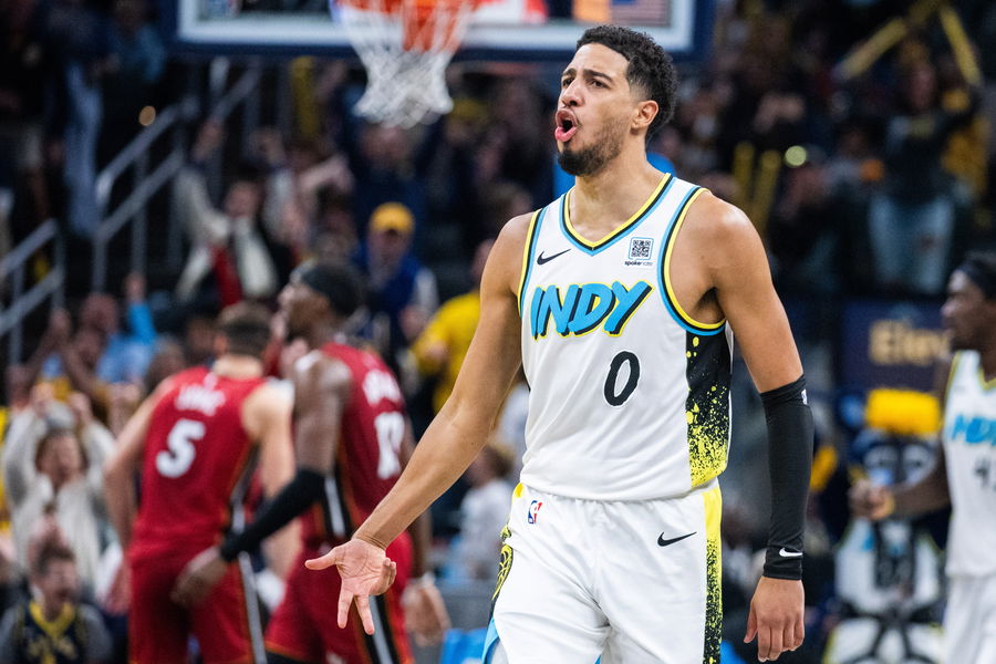 Nov 17, 2024; Indianapolis, Indiana, USA; Indiana Pacers guard Tyrese Haliburton (0) celebrates a made basket in the second half against the Miami Heat at Gainbridge Fieldhouse. Mandatory Credit: Trevor Ruszkowski-Imagn Images