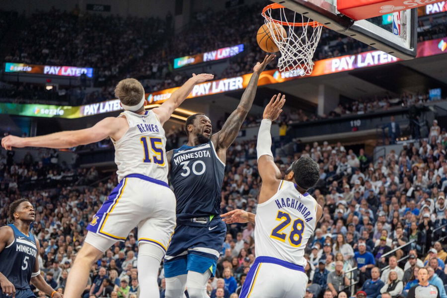 Apr 27, 2025; Minneapolis, Minnesota, USA; Minnesota Timberwolves forward Julius Randle (30) shoots as Los Angeles Lakers guard Austin Reaves (15) and forward Rui Hachimura (28) defend in the third quarter during game four of first round for the 2025 NBA Playoffs at Target Center. Mandatory Credit: Matt Blewett-Imagn Images