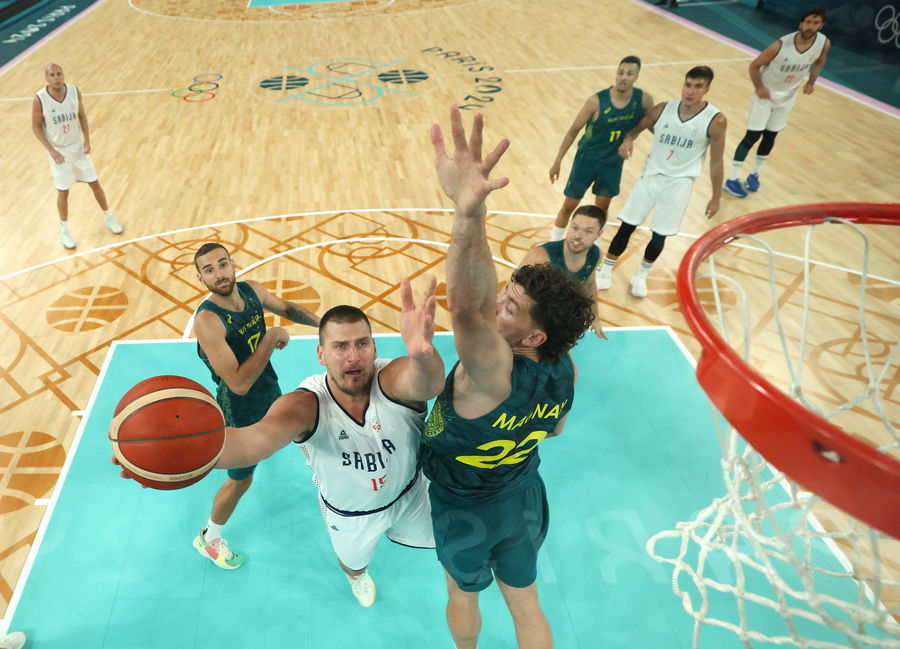 Paris 2024 Olympics – Basketball – Men’s Quarterfinal – Serbia vs Australia – Bercy Arena, Paris, France – August 06, 2024. Nikola Jokic of Serbia in action against Will Magnay of Australia Pool via REUTERS/Jamie Squire