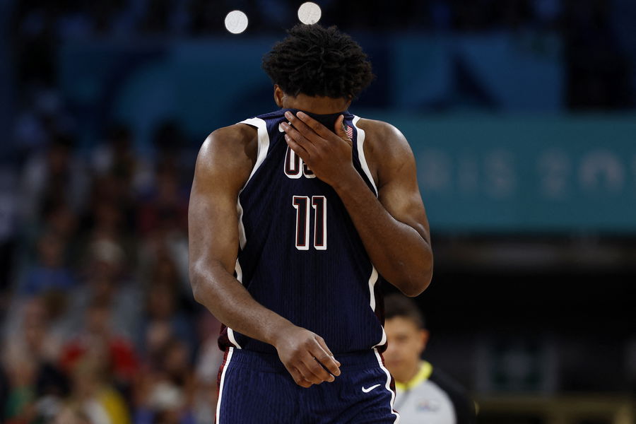 Paris 2024 Olympics – Basketball – Men’s Group Phase – Group C – Puerto Rico vs United States – Lille, Pierre Mauroy Stadium, Villeneve-d’Ascq, France – August 03, 2024. Joel Embiid of United States reacts REUTERS/Evelyn Hockstein