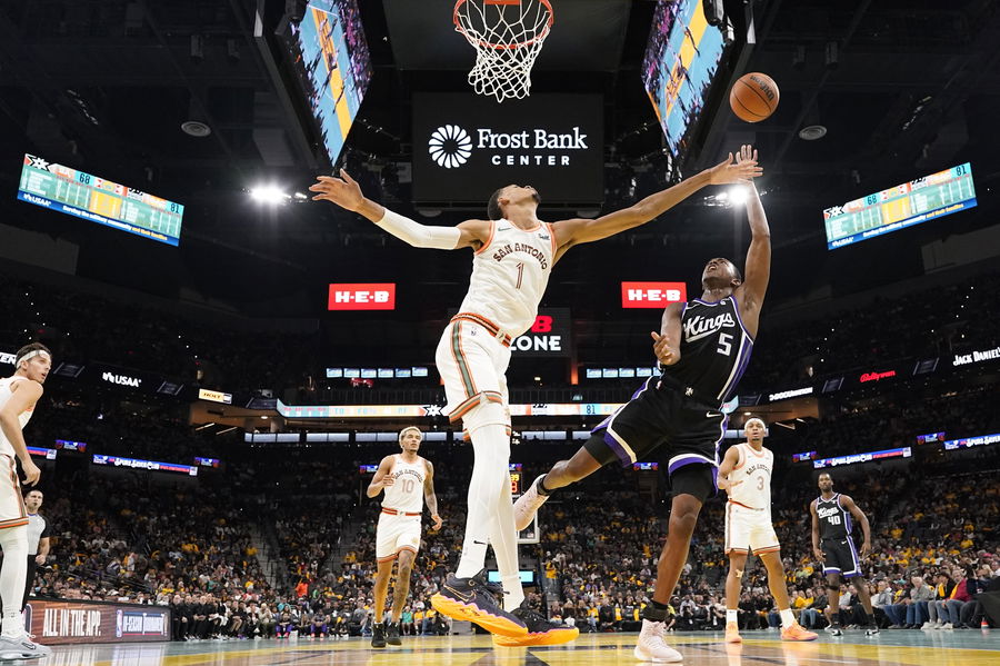 Nov 17, 2023; San Antonio, Texas, USA; Sacramento Kings guard De’Aaron Fox (5) shoots over San Antonio Spurs forward Victor Wembanyama (1) during the second half at Frost Bank Center. Mandatory Credit: Scott Wachter-USA TODAY Sports