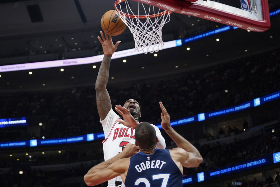 Feb 6, 2024; Chicago, Illinois, USA; Chicago Bulls center Andre Drummond (3) shoots over Minnesota Timberwolves center Rudy Gobert (27) during the first quarter at United Center. Mandatory Credit: David Banks-USA TODAY Sports